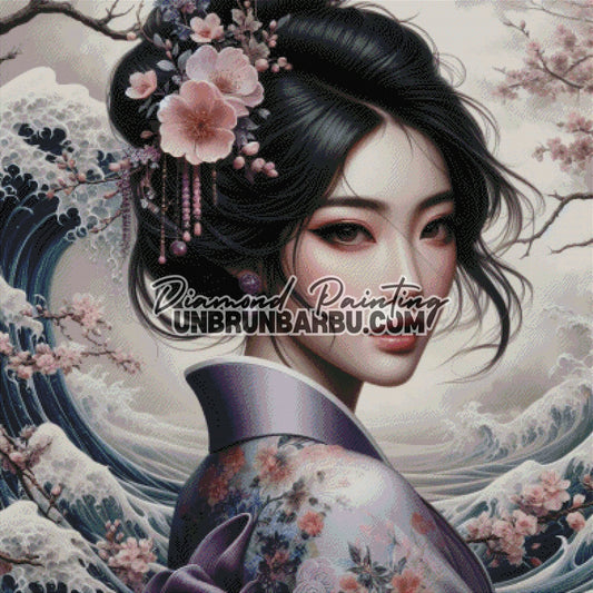 Élégance Asiatique au Cœur des Vagues (100cm x 100cm)