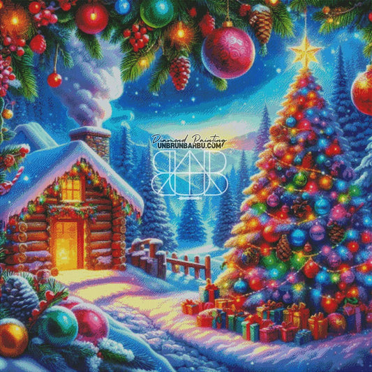 Chalet Enchanté au Milieu des Arbres Festifs. (120cm x 120cm)