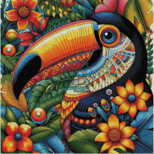 Toucan Éclatant parmi les Fleurs Colorées. (60cm x 60cm).