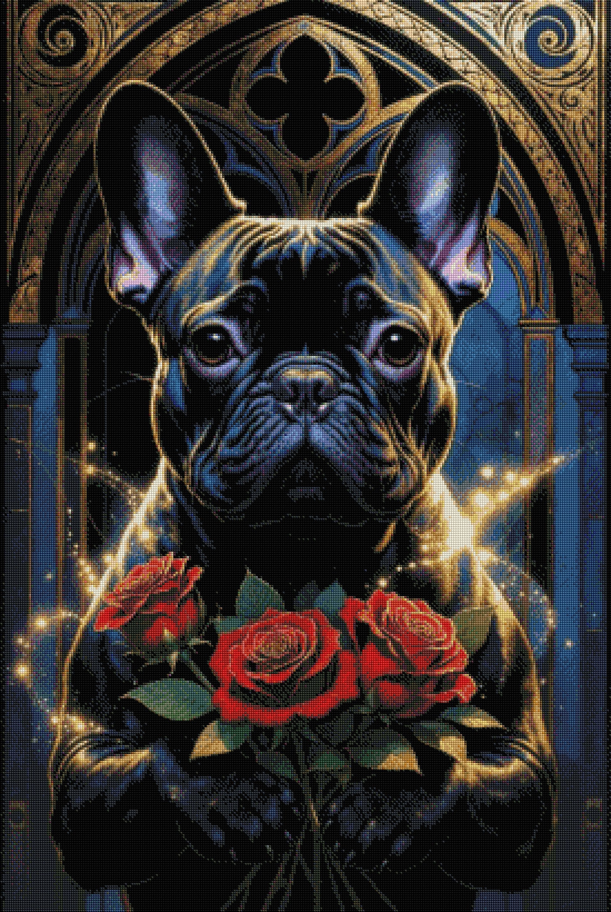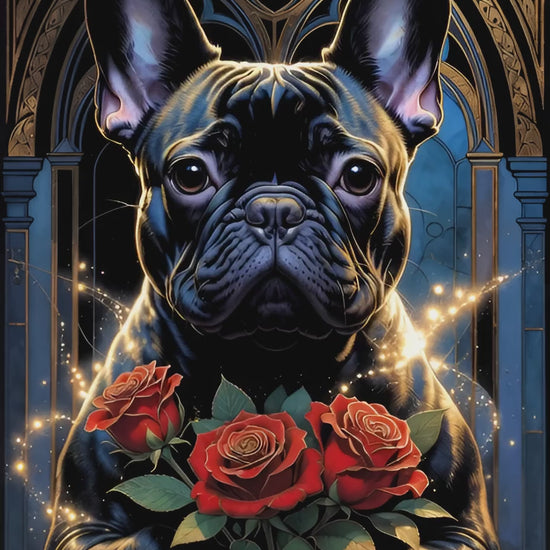 C'est une toile qui promet une expérience de broderie diamant très satisfaisante : vous allez adorer travailler les contrastes entre le noir profond du pelage, l'éclat doré des ornements en arrière-plan et le rouge passion des fleurs. Les jeux de lumière et les petites étincelles magiques autour du chien donneront un relief incroyable une fois les diamants posés.