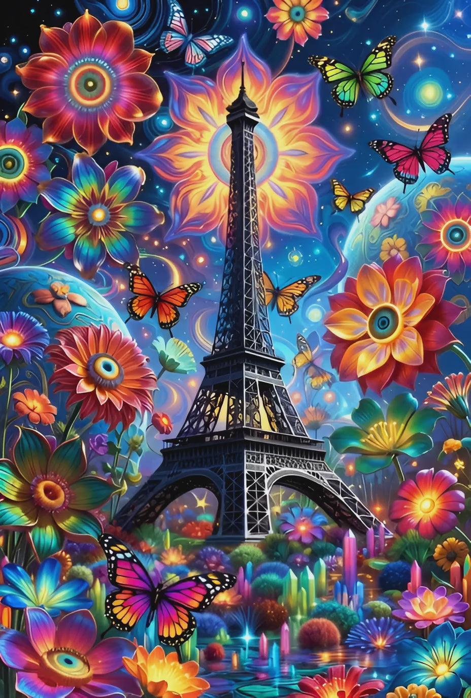 On raconte qu’au cœur du ciel, la Tour Eiffel veille sur un jardin secret. Chaque pétale est une étincelle, chaque couleur un vœu… et quand un papillon passe, la chance s’accroche à tes pensées.