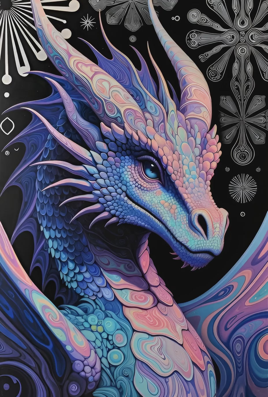 Dans le silence de la nuit, ses écailles captent les rêves comme des éclats d’opale. On dit que chaque spirale sur sa peau est un vœu protégé par d’anciennes runes.
