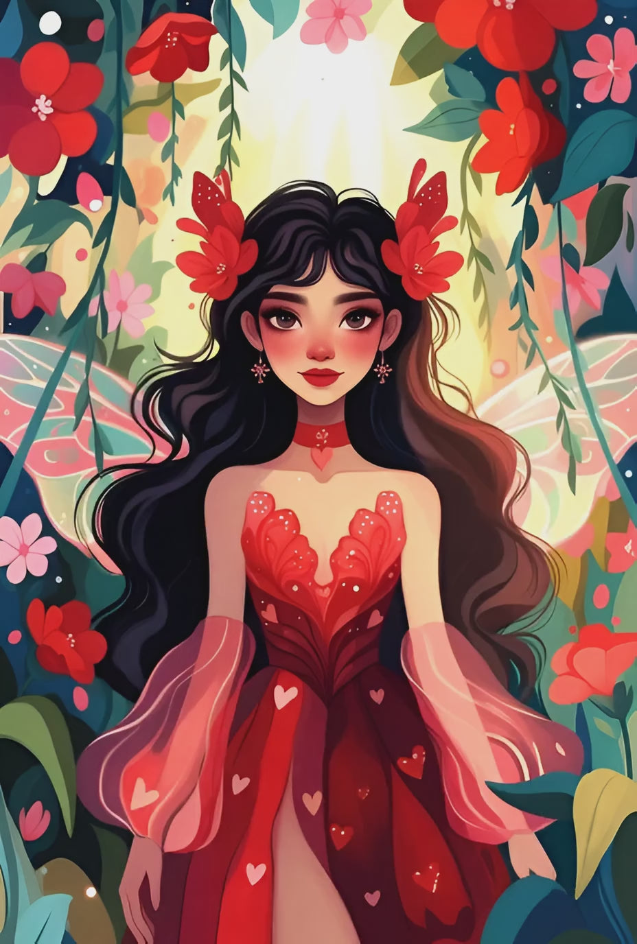 Sous un ciel de lumière pastel, une jeune gardienne des fleurs avance entre les lianes et les corolles. À chacun de ses pas, des éclats d’amour naissent dans le jardin, comme des étoiles prêtes à briller.