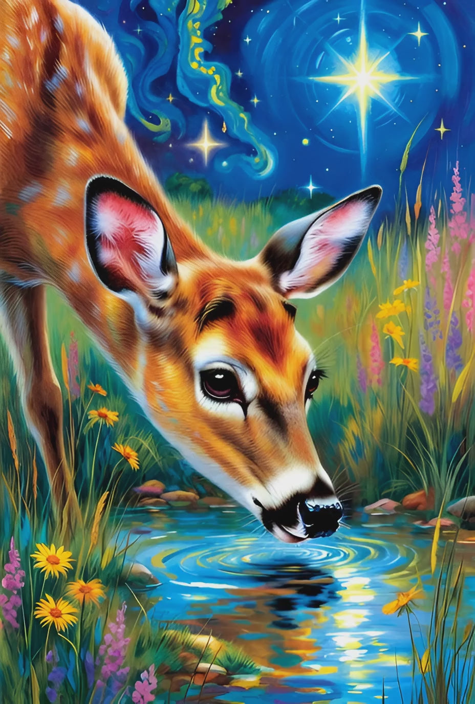 Sous un ciel profond illuminé par une grande étoile, un jeune faon s’approche d’un ruisseau calme. Chaque reflet dans l’eau semble porter un vœu, comme si la nuit elle-même veillait sur lui. Une scène tendre et magique qui invite au calme.