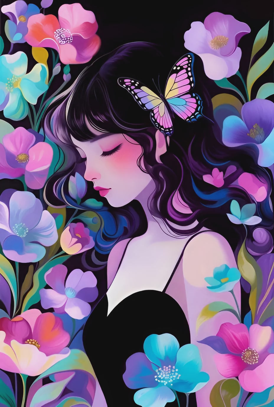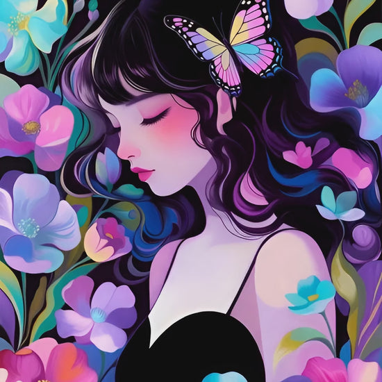 Ses yeux clos cachent un monde enchanté où les fleurs brillent comme des étoiles. Le papillon, gardien discret de ce jardin secret, guide les âmes rêveuses vers la sérénité.
