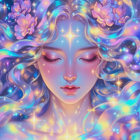 Ses boucles sont des vagues de galaxies, tendres et lumineuses. Chaque reflet raconte une histoire d’amour entre l’ombre et la lumière.