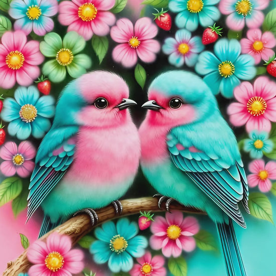 Ils se parlent sans bruit : un battement d’ailes, un regard, et le monde devient plus doux. On dit que lorsqu’ils se touchent du bout du bec, la chance fleurit autour d’eux… et que chaque pétale garde un vœu, prêt à être réveillé diamant après diamant ✨