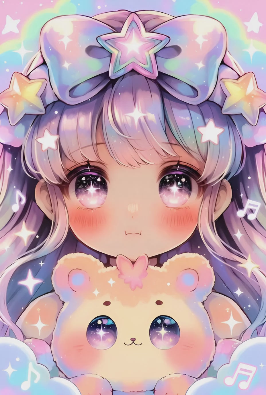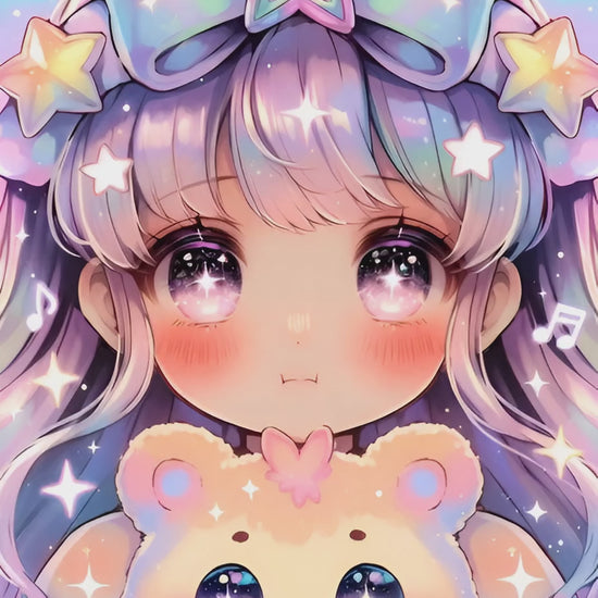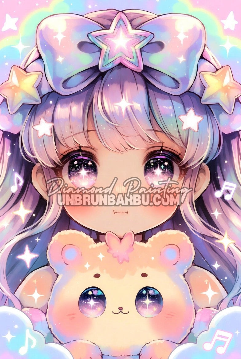 Elle vit dans un royaume de coton, là où les nuages fredonnent. Les étoiles accrochées à ses cheveux brillent à chaque petite note. Son ourson est le chef d’orchestre des câlins, sans jamais rater un tempo.