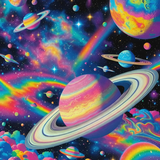 Aujourd'hui, Prisma a décidé de créer une nouvelle nébuleuse. Il active son canon, et un flot de lumière pure, concentré de toutes les couleurs de l'univers, jaillit. Là où le rayon touche le vide, des volutes de gaz rose, bleu et or commencent à se former, dansant et s'enroulant pour créer un nouveau chef-d'œuvre céleste. Satisfait, Prisma fait un looping autour d'une planète annelée géante, laissant derrière lui une traînée de poussière d'étoiles scintillante, prêt à colorer un autre coin de cet univers infini et joyeux.
