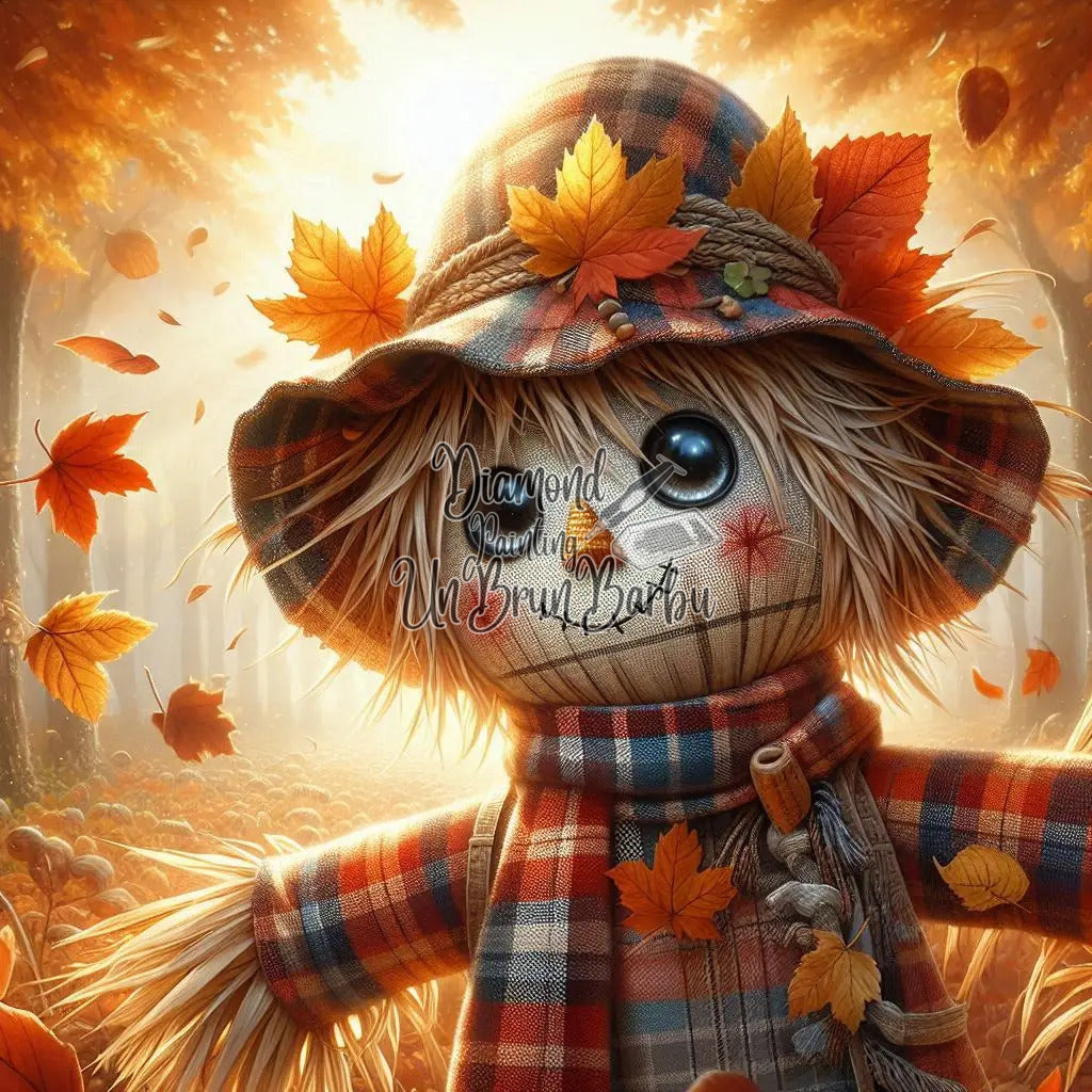 Oubliez les épouvantails qui font peur ! Celui-ci est un concentré de tendresse et de charme automnal. Avec son grand œil de bouton bleu qui brille, son nez rapiécé et sa bouche cousue d'un sourire timide, il est l'ami le plus adorable des bois.