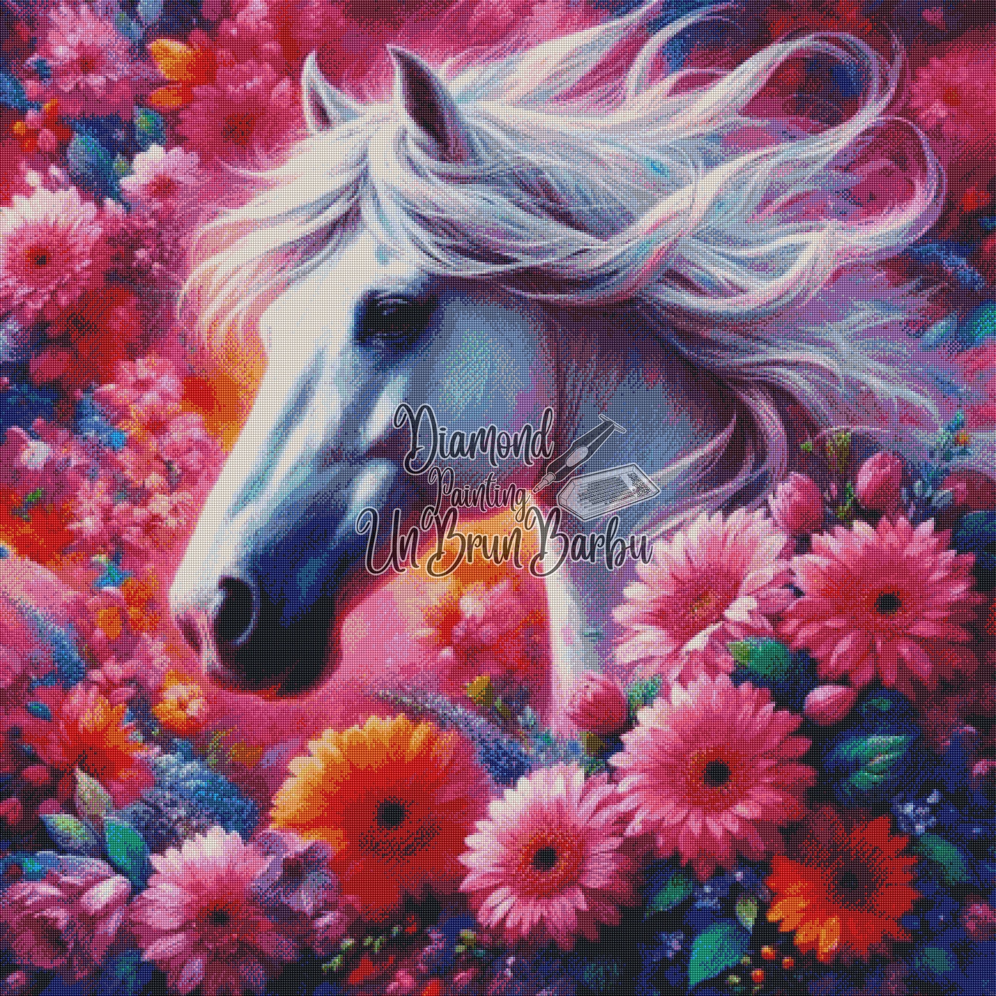 Cheval Féérique au Cœur des Fleurs (110cm x 110cm)