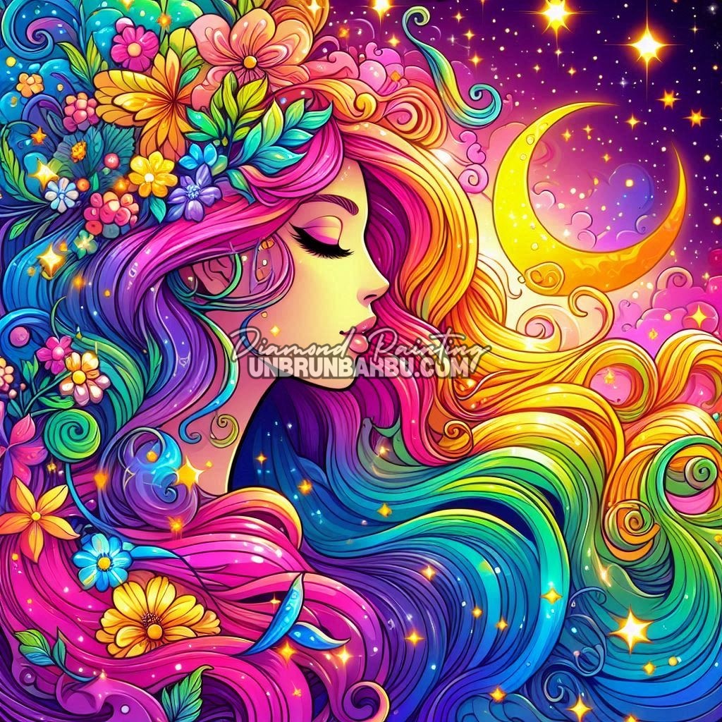 Sous la lumière douce de la lune, une déesse endormie veille sur le monde des songes. Sa chevelure, tissée d’arcs-en-ciel et de fleurs célestes, danse avec les étoiles et répand une pluie de couleurs dans la nuit.