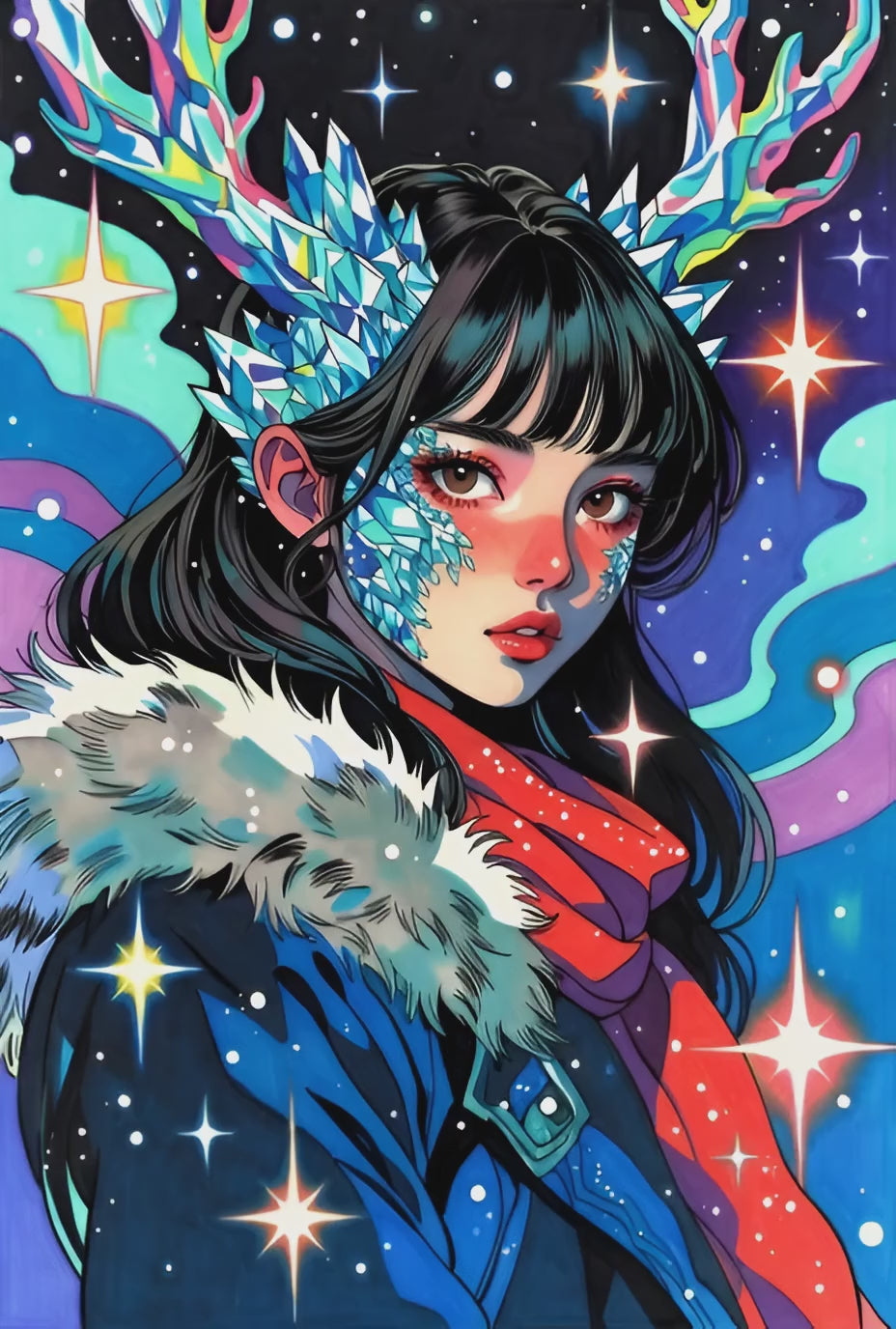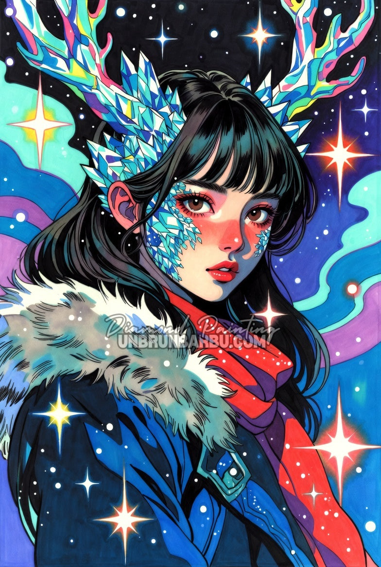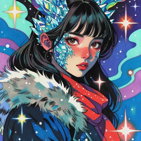 La glace sur ses joues ressemble à des bijoux. Et autour d’elle, les étoiles explosent comme des paillettes. Une toile qui mélange puissance et poésie… comme un hiver qui brille.