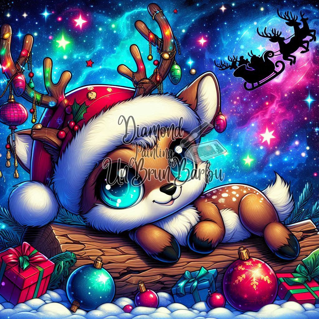 Blotti sur une bûche, avec son bonnet de Père Noël et ses bois décorés de guirlandes festives, il lève ses immenses yeux d'azur vers le ciel. Et quelle vue ! Des nébuleuses aux couleurs vibrantes s'entremêlent avec des myriades d'étoiles, formant une toile cosmique à couper le souffle. Au loin, il aperçoit l'ombre familière du traîneau du Père Noël.