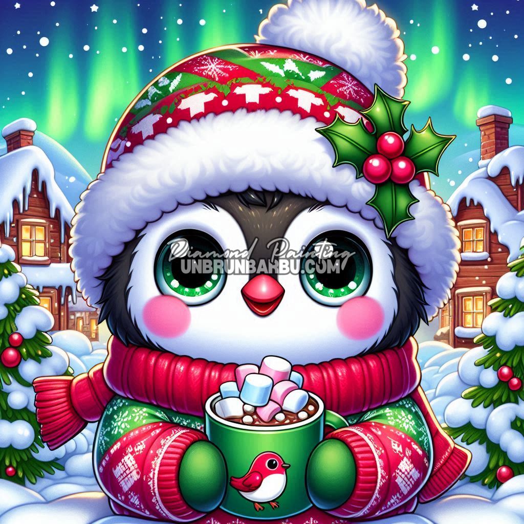 Au cœur d’un village enneigé, un petit pingouin emmitouflé savoure son chocolat chaud, parsemé de guimauves. Ses grands yeux verts reflètent les lumières des aurores boréales qui illuminent le ciel.