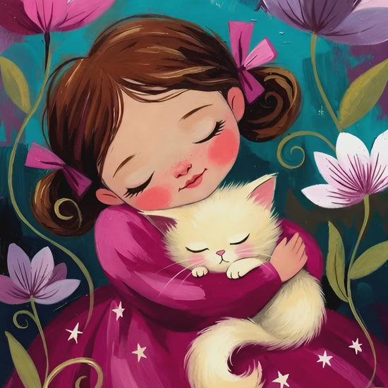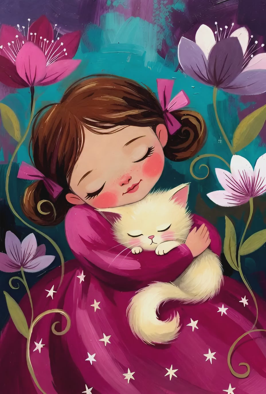 Quand elle le prend dans ses bras, le chat ferme les yeux. Son ronron raconte une histoire : celle des chagrins qui s’envolent, des peurs qui fondent, et des cœurs qui se réparent… tout doucement.